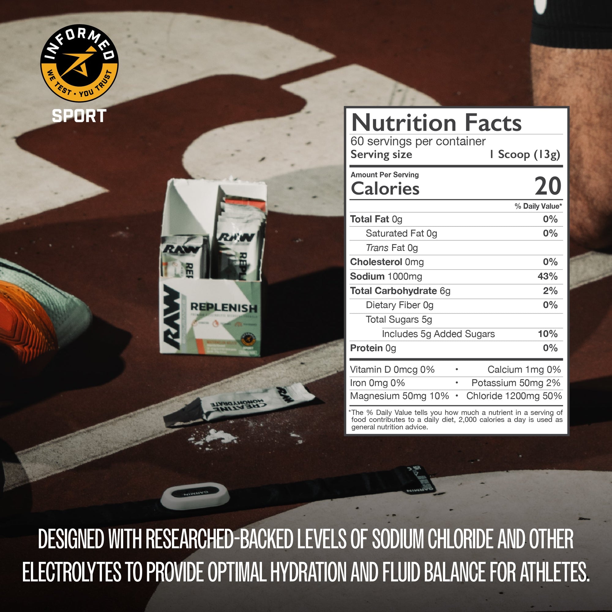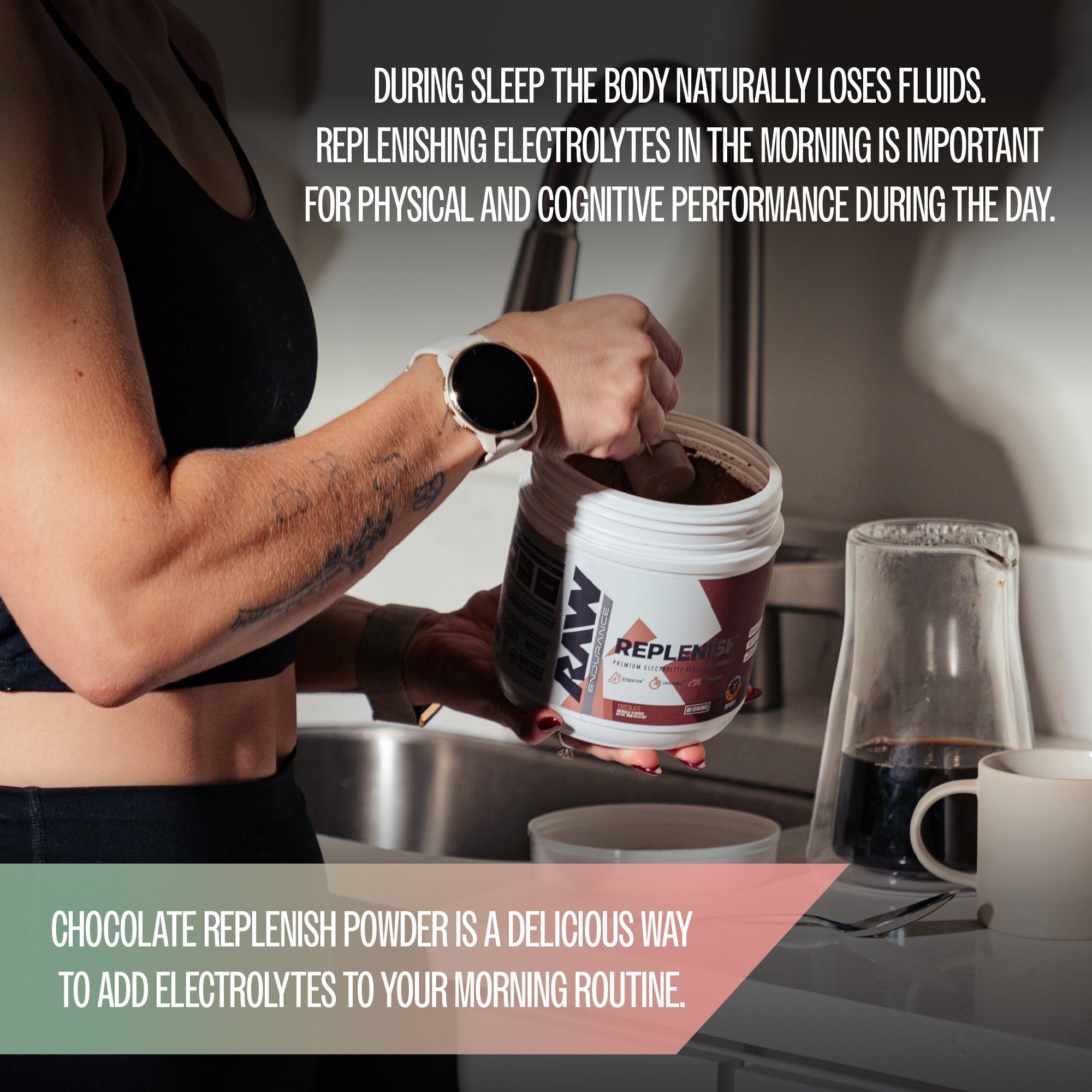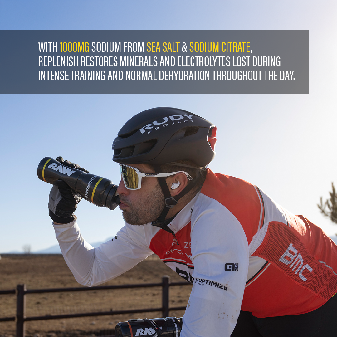Replenish is designed with researched-backed levels of sodium chloride and sodium citrate, plus other electrolytes to provide optimal hydration and fluid balance for endurance athletes and to be the #1, go-to solution for daily hydration.